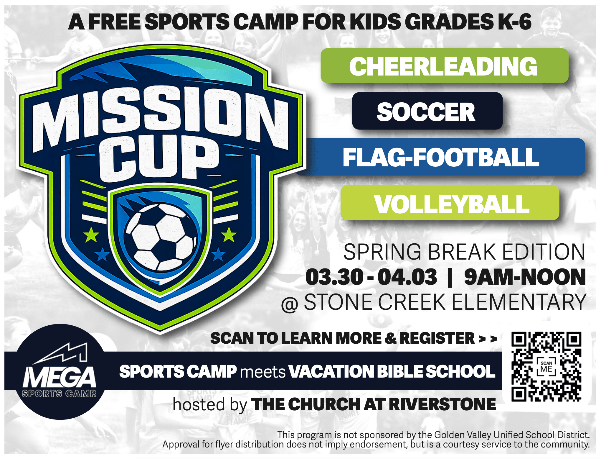 MEGA Sports Camp provides a FREE opportunity for students grades K-6 to learn about the love of Jesus while participating in some of the extra-curricular activities they love most.